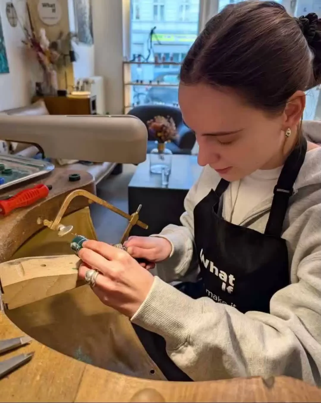The gallery presents a modern look that matches the young, alternative, and yet elegant and picturesque atmosphere of Prenzlauer Berg, the historical neighbourhood where What If is located at.The name What If wants to provoke and invite to think out of the box, out of the classic idea of jewellery.